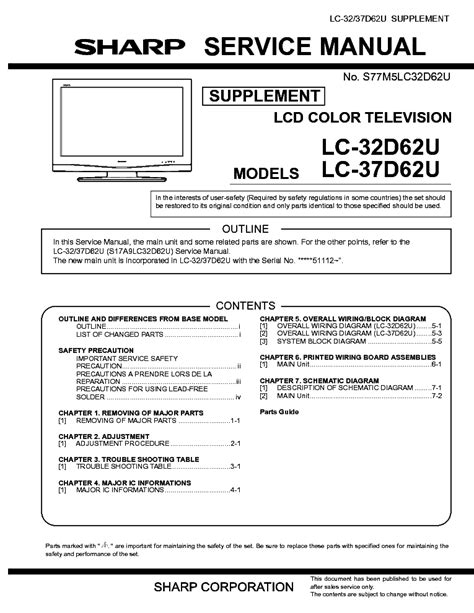 Currently you are looking for an Sharp Lc 32d62u 37d62u Service Manual Repair Guide example that we provide here within some kind of document formats many of these as PDF, Doc, Power Point, and also images that will make it simpler for you to create an Sharp Lc 32d62u 37d62u Service Manual Repair Guide yourself. For a more clear look, you are able to open several examples below. Each of the examples about Sharp Lc 32d62u 37d62u Service Manual Repair Guide about this site, we get from many sources so you could create a better document of your own.